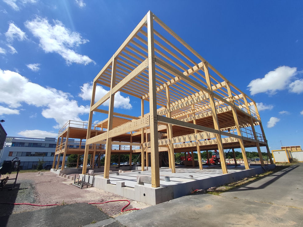 Pour répondre aux exigences du référentiel E+C-, nous avons conçu une ossature principale en poteaux-poutres Lamellé-Collé (LC) associée à des planchers mixtes bois-béton. La stabilité globale de l’ouvrage est assurée par un fonctionnement en diaphragme horizontal combiné aux façades en Mur Ossature Bois (MOB).