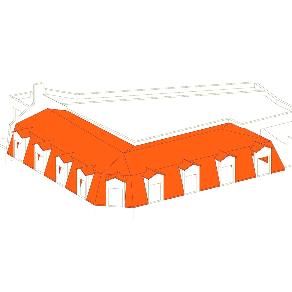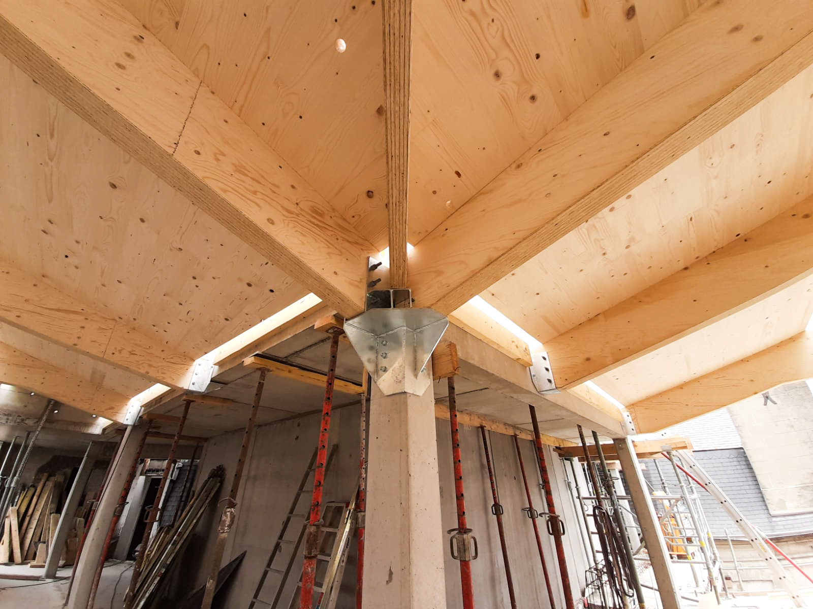 Pour cette dernière, le choix s’est porté sur une structure en bois CLT (Cross Laminated Timber). Ce matériau a permis non seulement la réalisation de la charpente, mais aussi la conception d’éléments architecturaux singuliers, tels que des niches suspendues dans les dortoirs, démontrant notre capacité à adapter la structure au design intérieur.